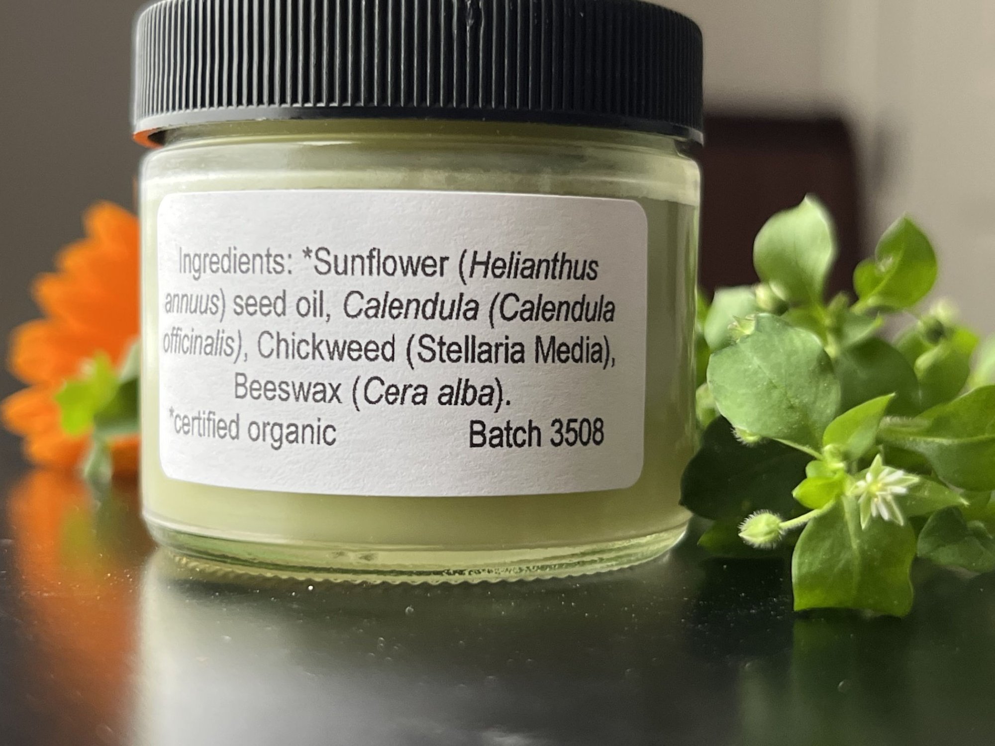 Calendula and Chickweed salve, in a 2 ounce glass jar, made with my organically grown calendula and chickweed flowers. Handmade by me for you, in small batches.