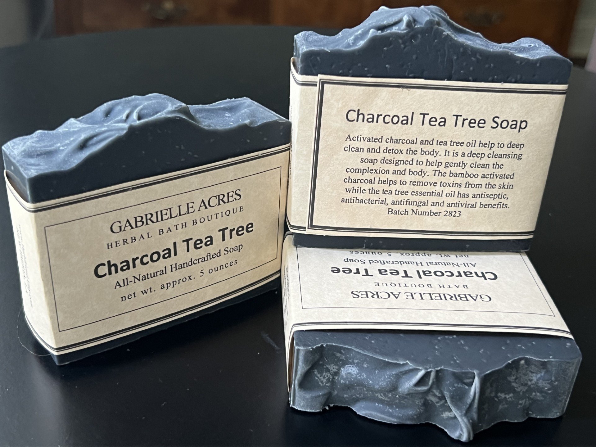 Materials: Olive oil, coconut oil, cocoa butter, sunflower oil, castor bean oil, activated bamboo charcoal, tea tree oil, distilled water, sodium hydroxide